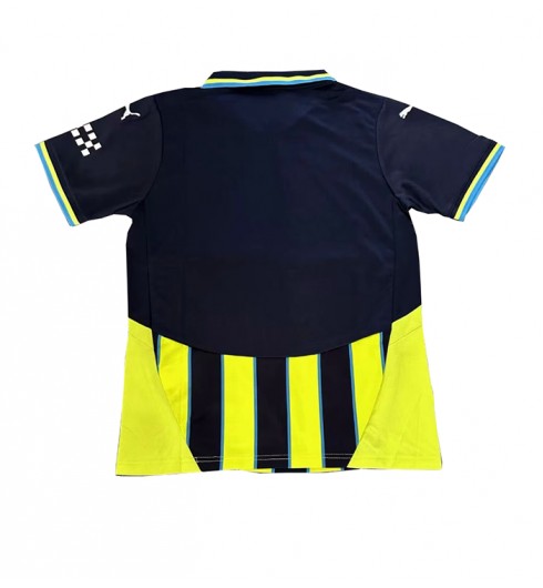 Gostujoča majica Man City 24/25 ima osupljivo mornarsko modro podlago, okrašeno z neonsko rumenimi navpičnimi črtami, ki spominjajo na kultni dres iz leta 1999. Ta drzen dizajn dopolnjujejo neonsko rumeni in modri poudarki na klasičnih obrobah ovratnikov in rokavov, ki ustvarjajo popolno mešanico nostalgije in sodobnega stila. Ta premišljena izbira oblikovanja služi kot močan opomin na klubsko pot in vzdržljiv duh, ki je skozi leta definiral Manchester City.